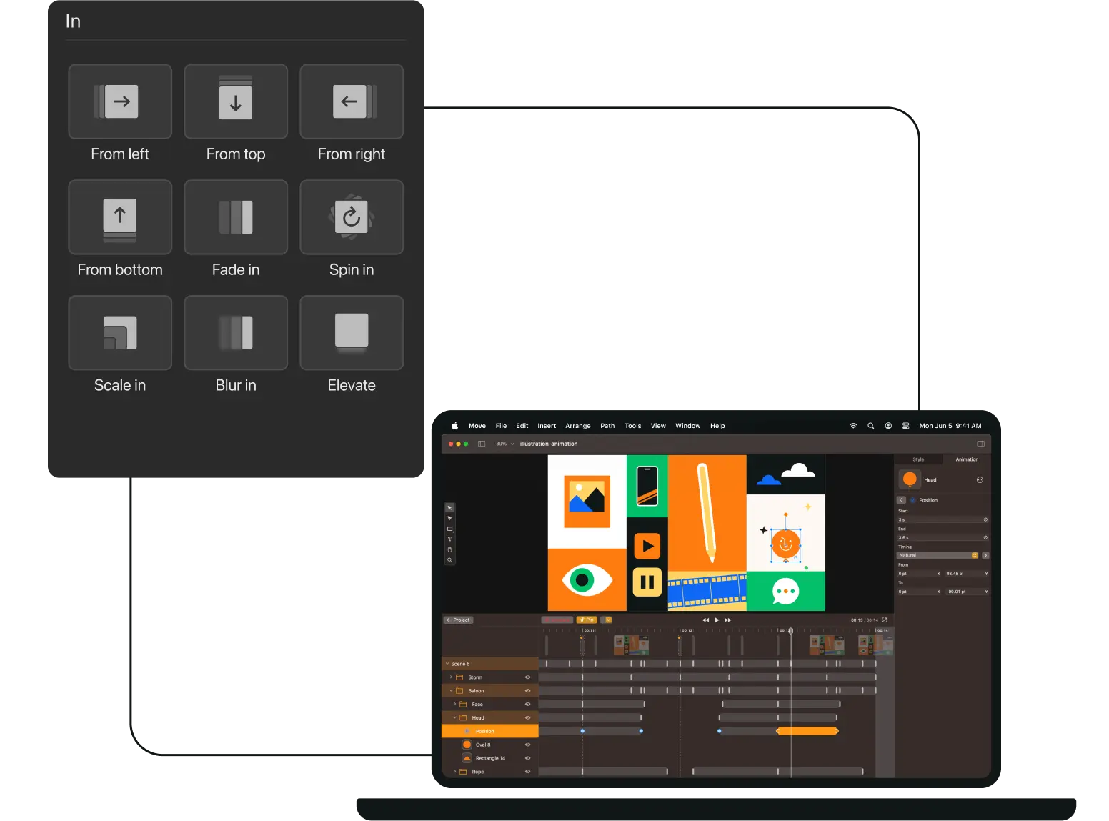 Import vector files seamlessly from Figma, Adobe Illustrator, Sketch, or Linearity Curve. Layers and groups are preserved for easier editing and animation.